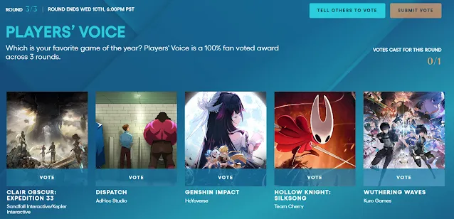 A primeira fase da categoria Players' Voice do TGA 2025 já está no ar, permitindo aos fãs escolherem seus favoritos entre 30 títulos. Corra, a votação dura apenas 24 horas!